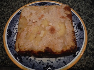 from Bev– It was a rainy, cold afternoon and I had some apples that were getting a little long in the tooth. I didn’t want to go out to the store. I began strolling through my cookbooks loo new book. Lo and behold there it was, a simple apple cake recipe, the ingredients for which I had in stock. So here is my attempt at this recipe. The finished product doesn’t look as good as it tastes.