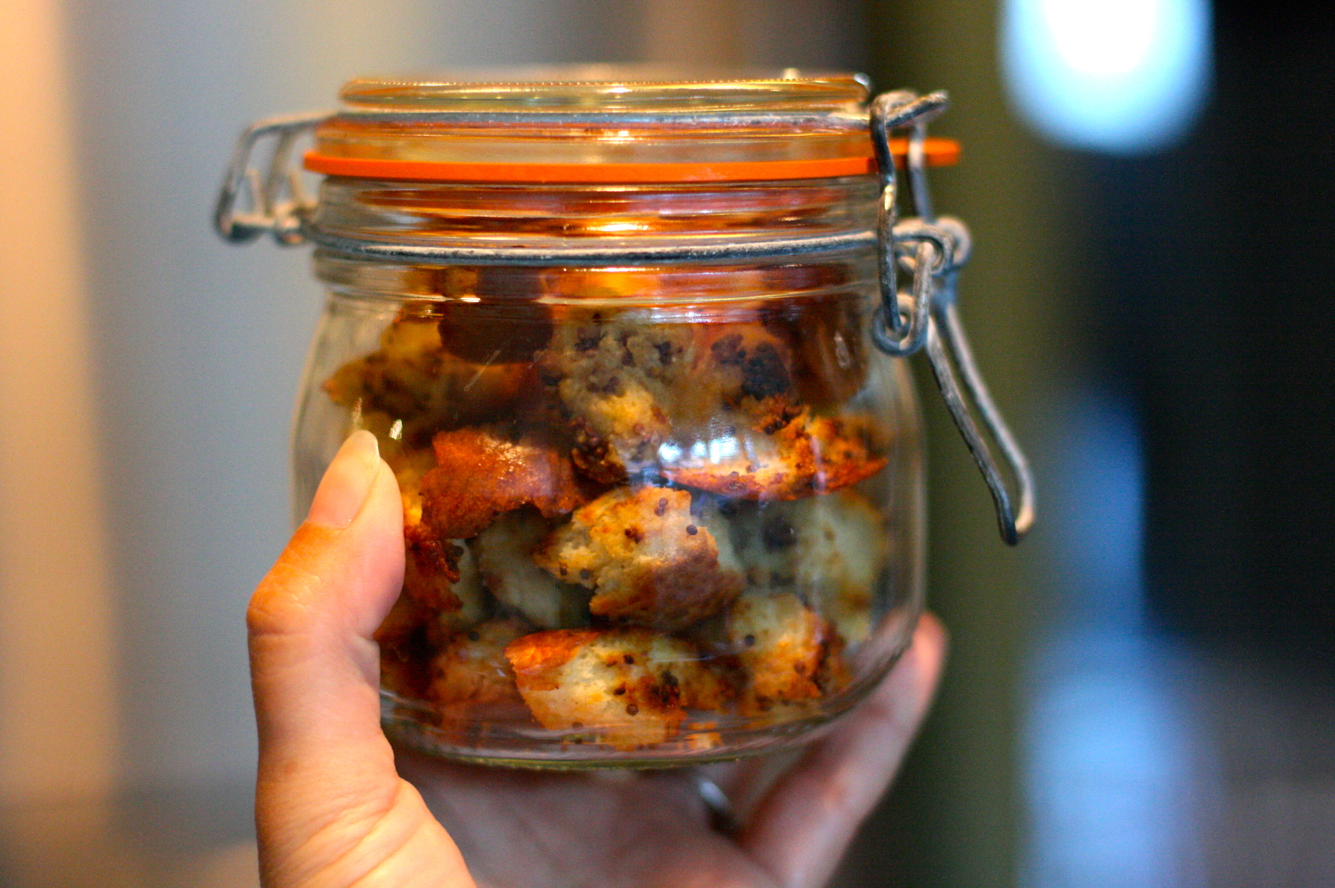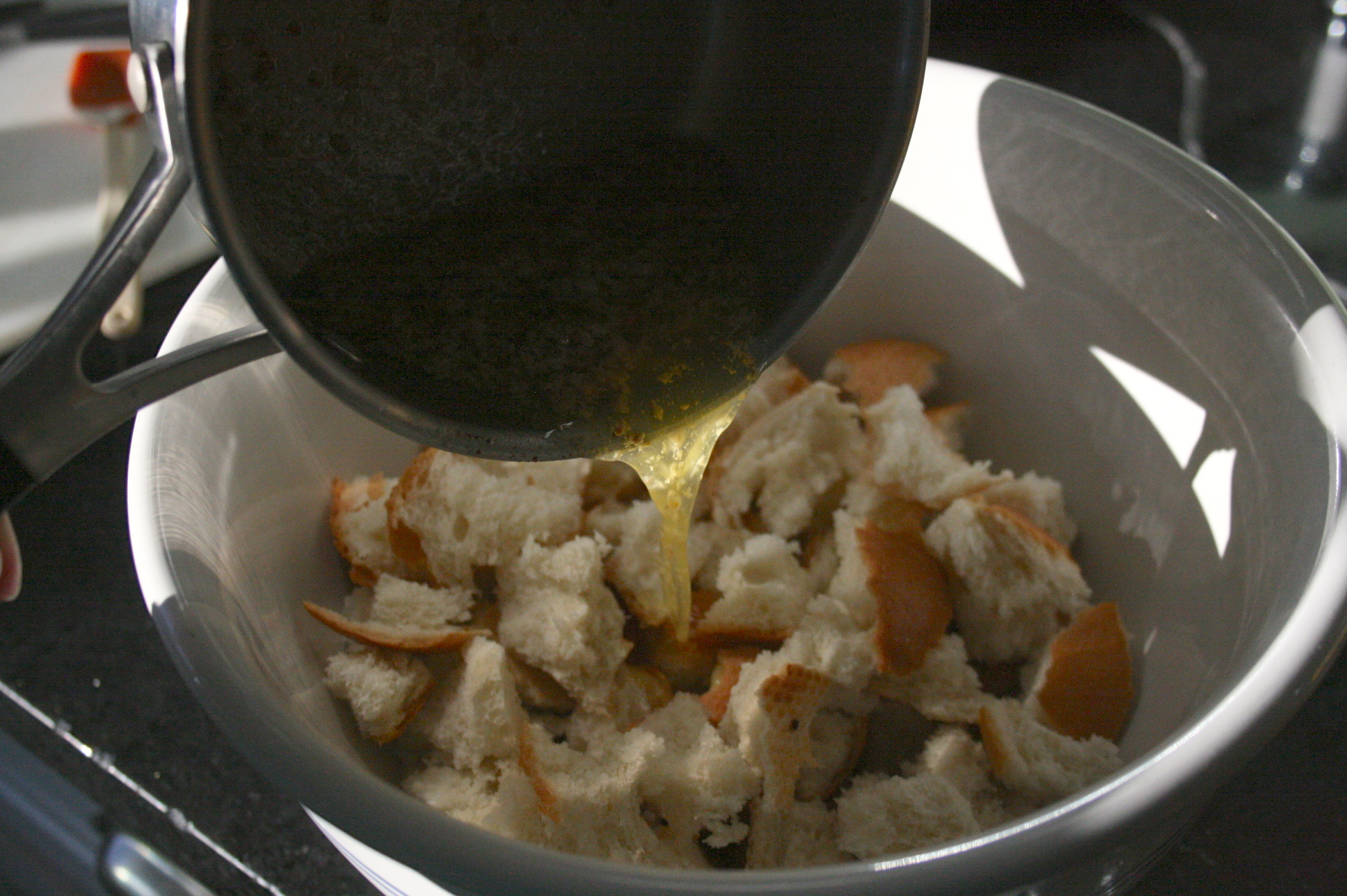 Start with some croutons- torn bread, mixed with a combo of olive oil, butter, salt and whole grain mustard.