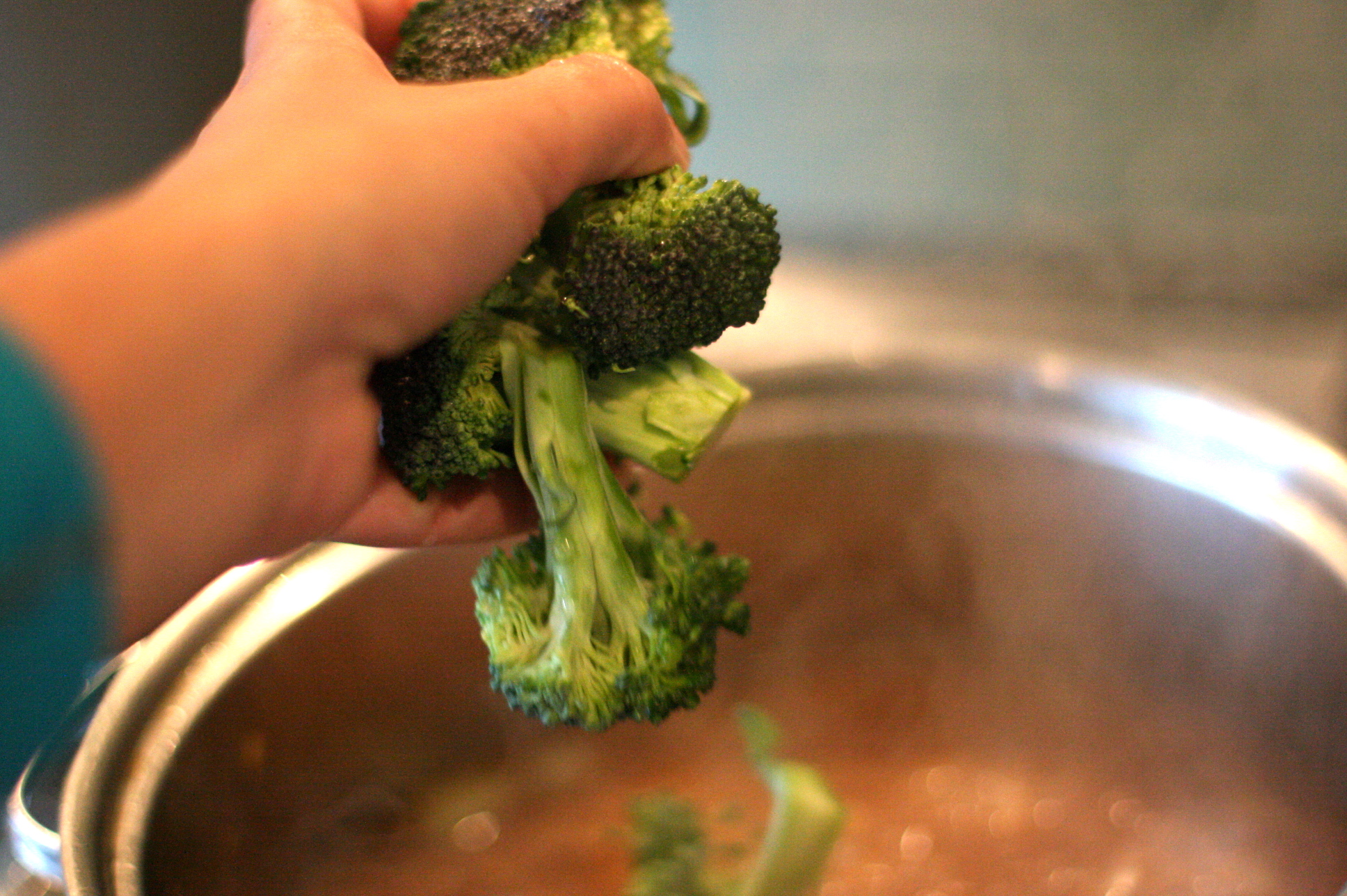 The potatoes simmered for about 4 minutes and were done. Broccoli goes in, another four minutes.