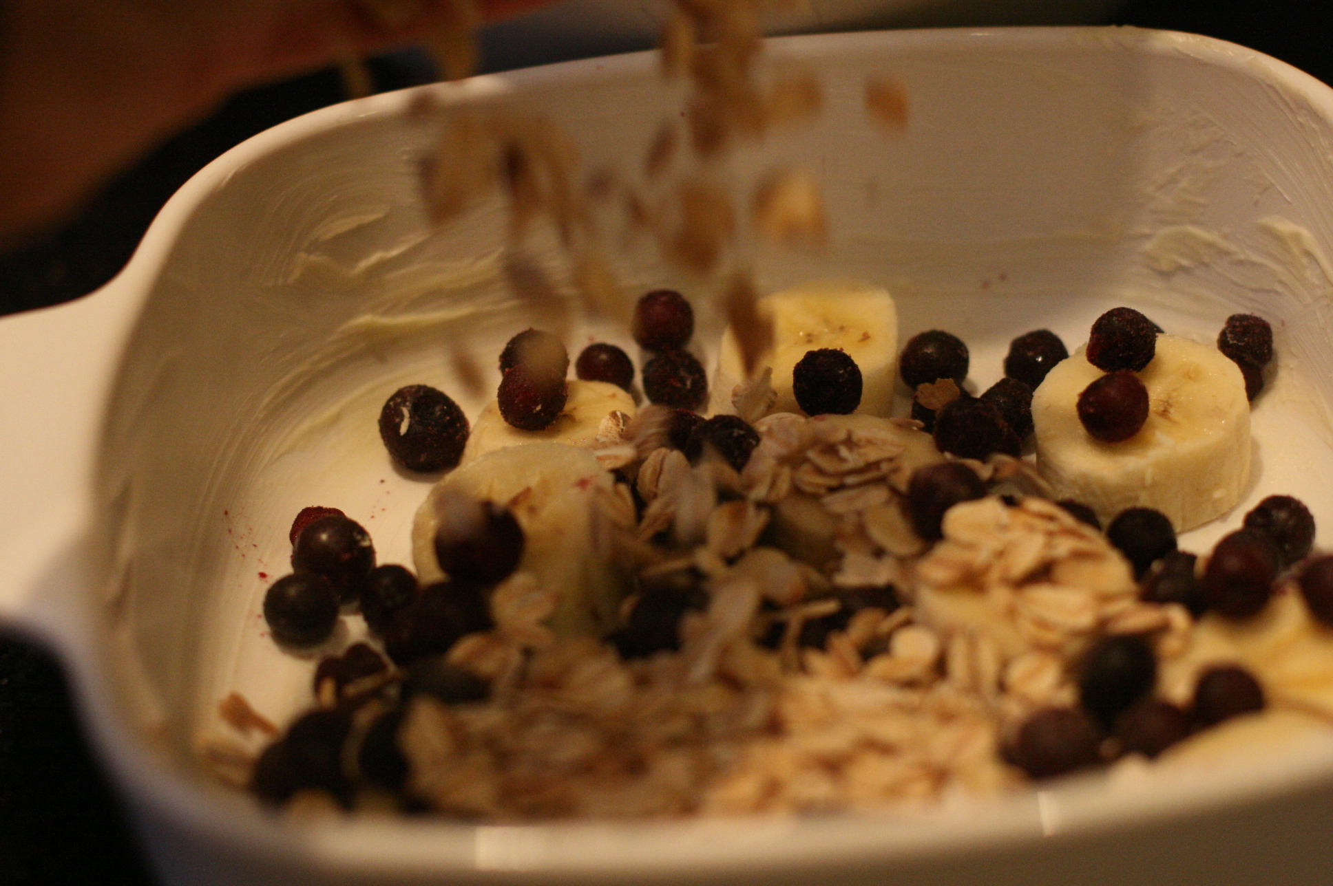 Bananas go on the bottom and some blueberries. Rolled oats and toasted walnuts get put on top.