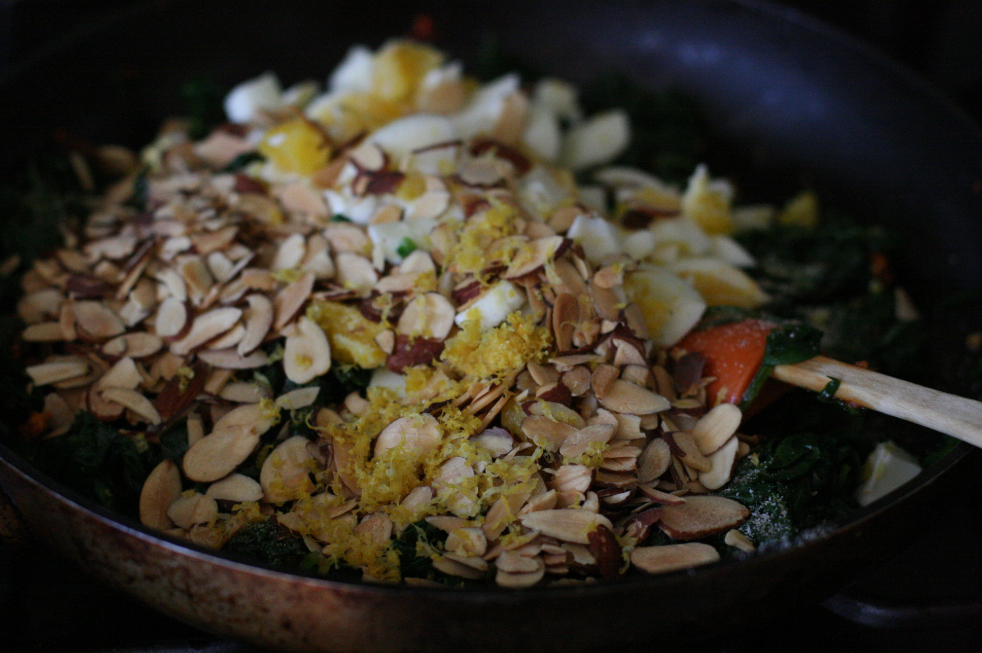 Eggs, almonds and spinach make up the bulk of this dish. Harissa gives it a kick.