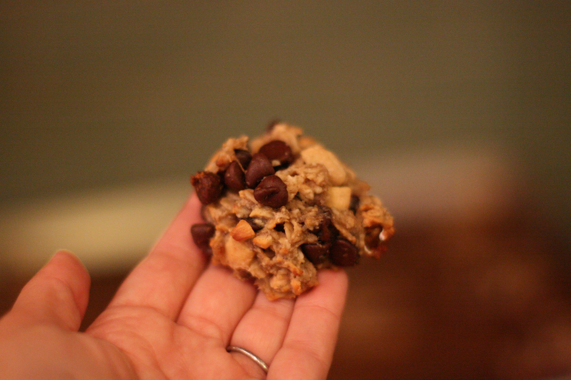 Carnival cookie. It has an odd mix of ingredients. Banana, chocolate chips, peanuts, popcorn… essentially everything you find at a carnival… minus sugar- which isn’t included.
