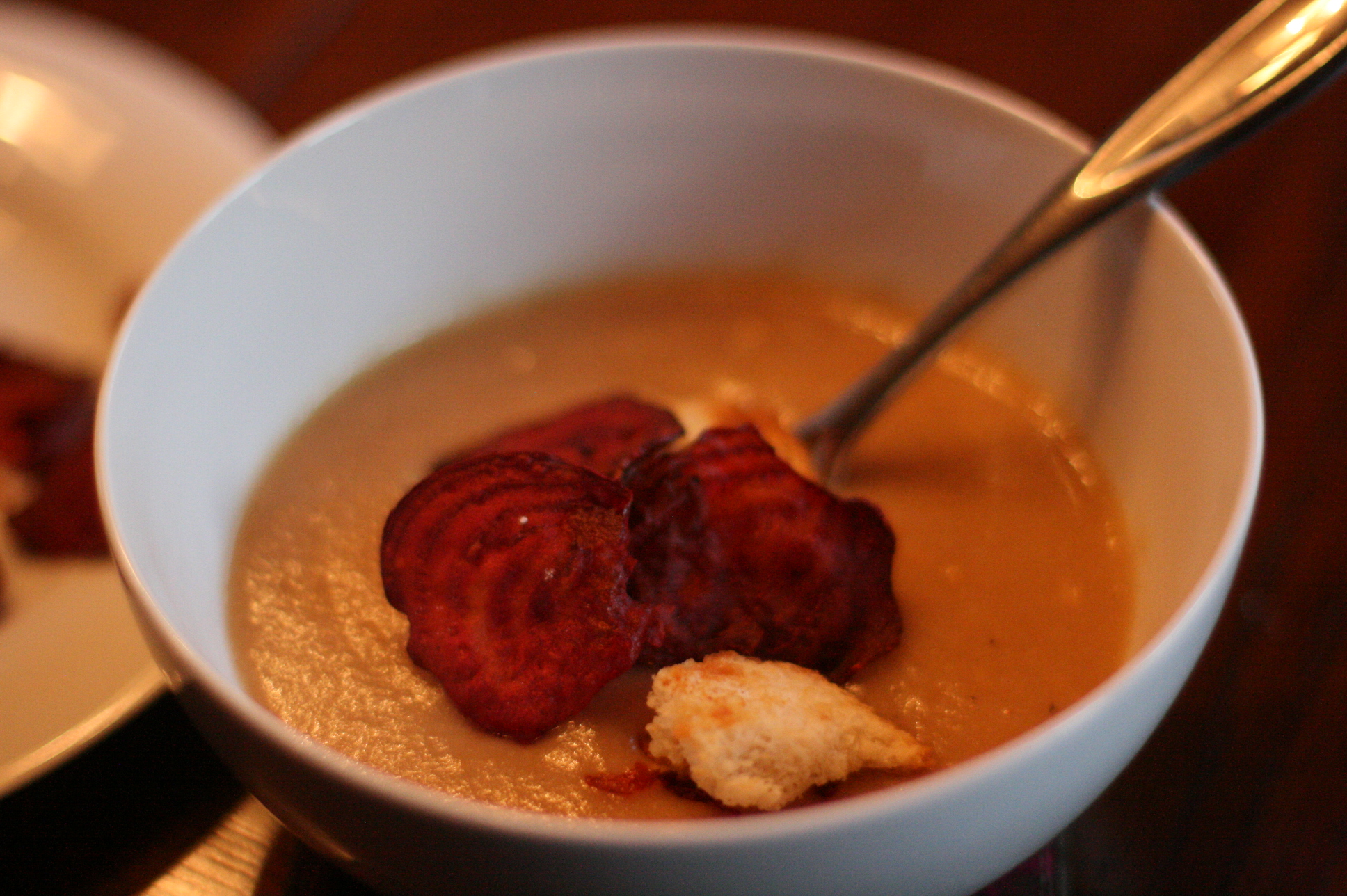 I also made the Cauliflower soup again and included some beet chips on top for color.