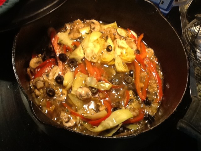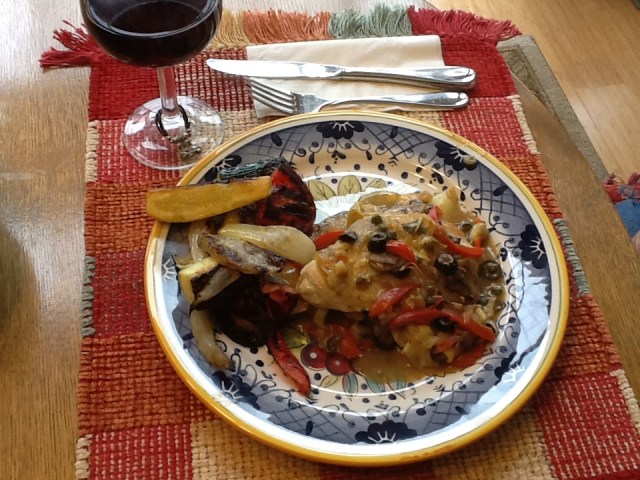 When everything is done, slice up some plums for garnish on the plate (be glad you went to the store and got red ones) and sit down to a wonderful dinner.