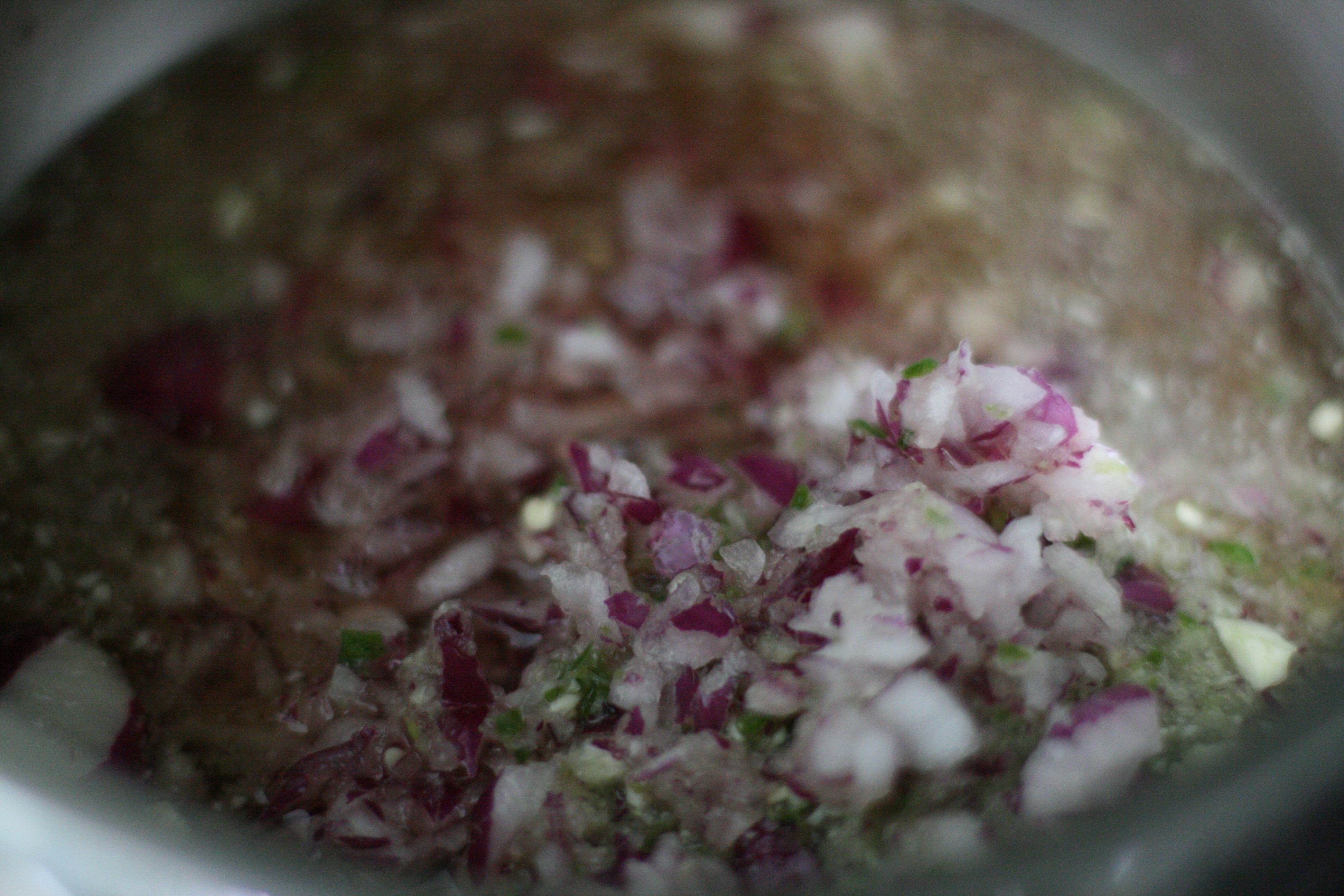 First, I made the mop- simmered onion, garlic and serrano chiles, cider vinegar, brown sugar…